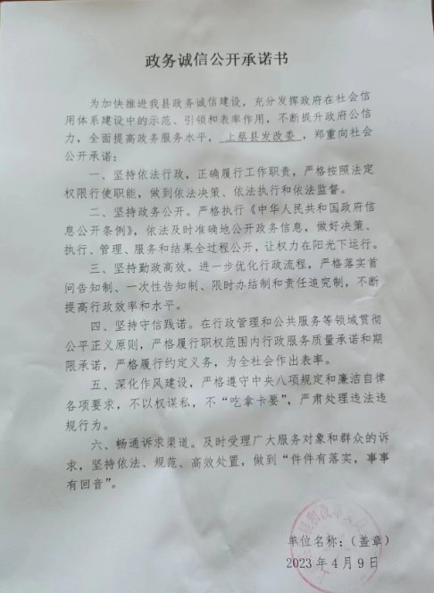 上蔡县发改委单位政务诚信公开承诺书