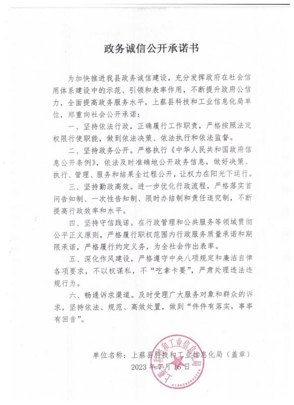 上蔡县科技和工业信息化局政务诚信公开承诺书