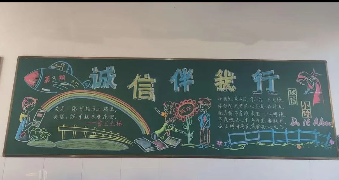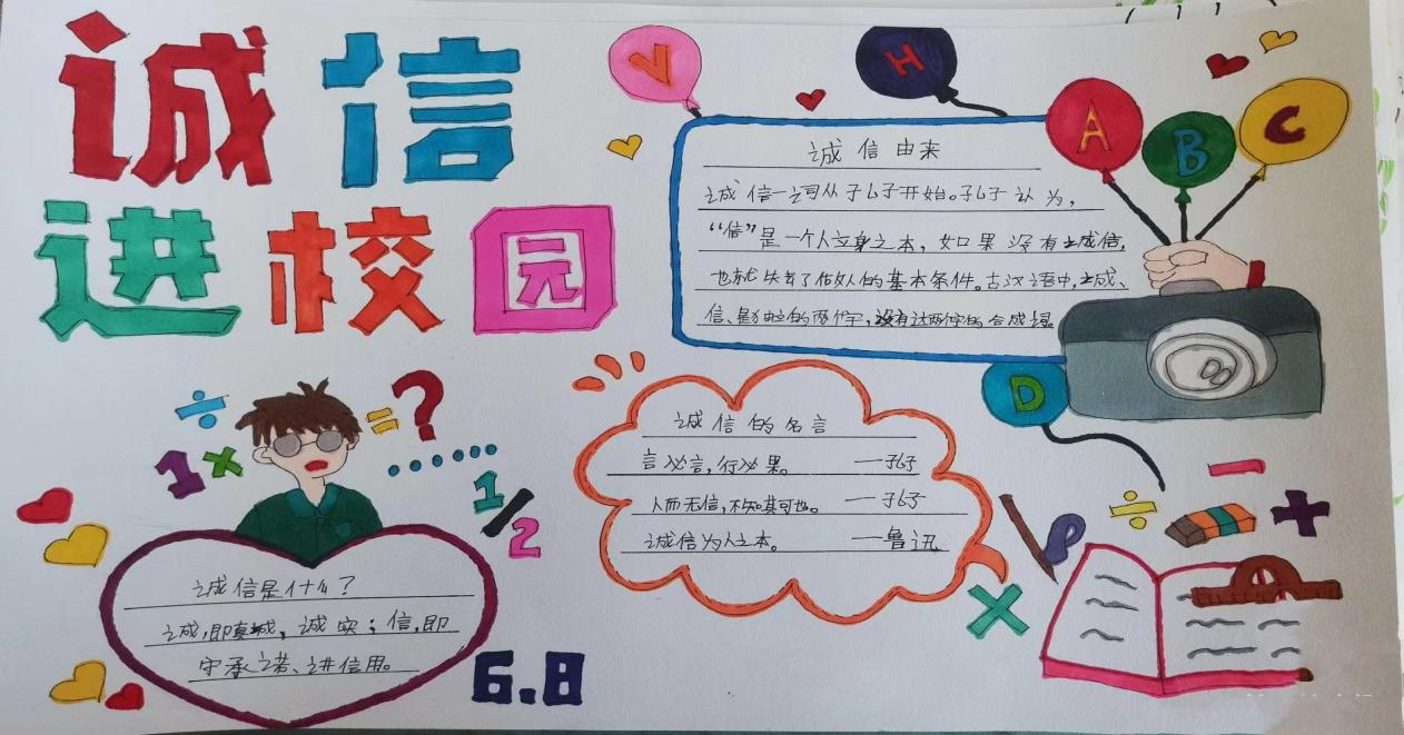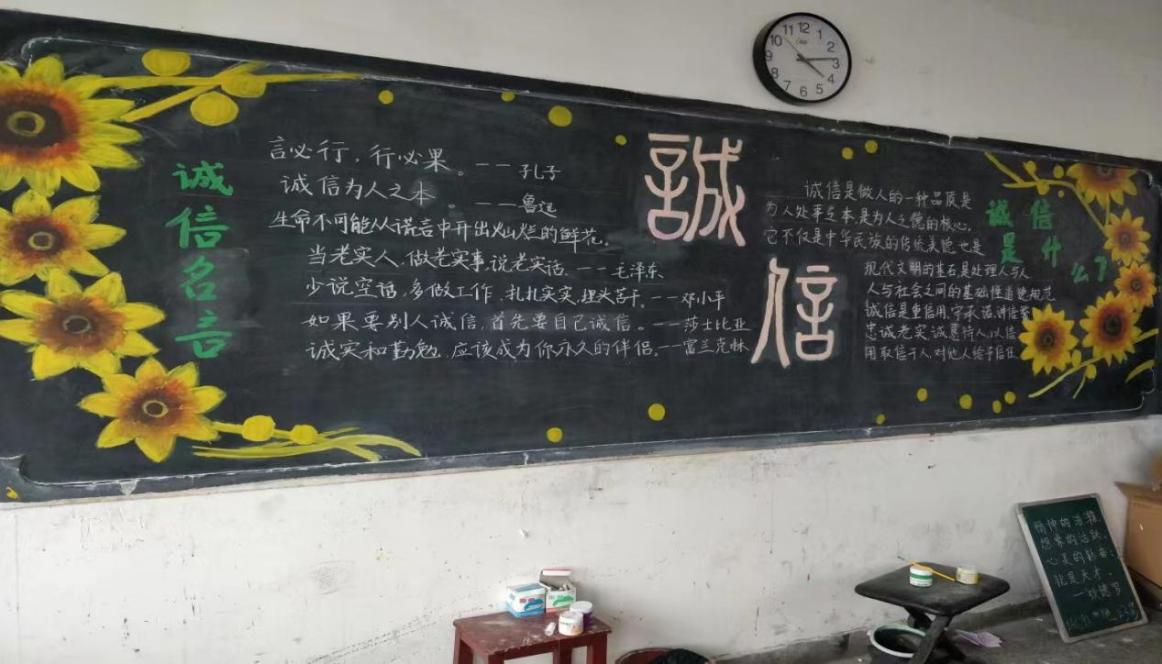 2、举办诚信板报评比。把诚信知识融入课堂,并紧扣“做诚信学生,建诚信班级,创诚信校园”主题,通过板报的形式进一步增强了学生的学习积极性,拓宽了学习范围,巩固了学习效果。